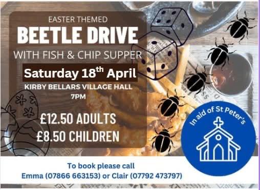 Raising funds to save St. Peters, come join us for an Easter-themed Beetle Drive with a Fish & Chip supper. Held at Kirby Bellars village hall, starting at 7pm, this evening is reportedly savage!